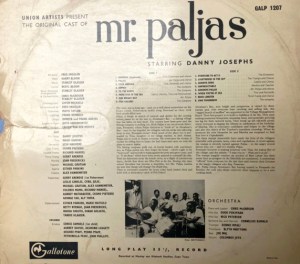 The driving force behind Mr Paljas was Stanley “Spike” Glasser.  He wrote the music based on a book by Harry Bloom. The lyrics were written by Beryl Bloom. Glasser was also musical director and wrote the arrangements for lyricist Todd Matshikiza’s King Kong. Harry Bloom wrote the King Kong book,