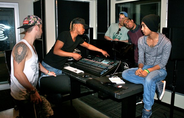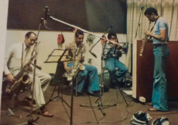 Basil “Manenberg” Coetzee, seated centre, with American jazzmen Harold Land, left, and Blue Mitchell, and Abdullah Ibrahim, standing. The photo is a studio shot when they were recording the album Bra Joe from Kilimanjaro in Johannesburg in 1979.
