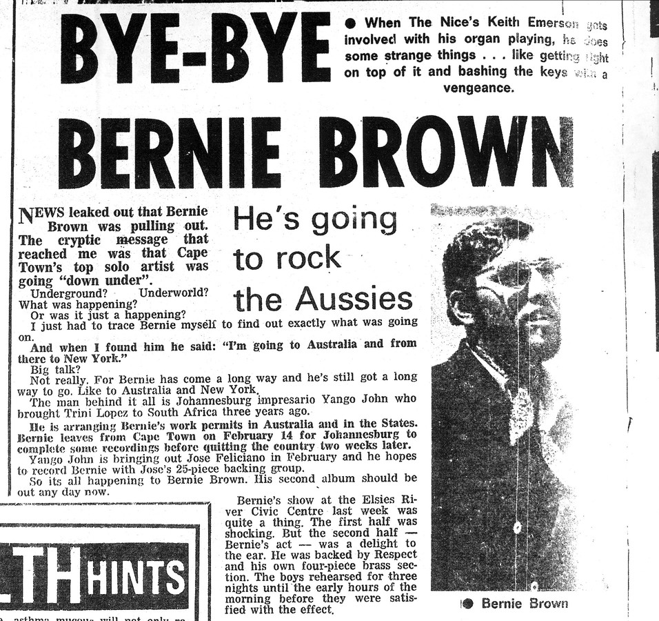 Bernie did squeeze in a visit to South Africa in 1983. He did a few clubs gigs with and tried to organize a Bernie Brown Variety Concert. It wasn’t a huge success.