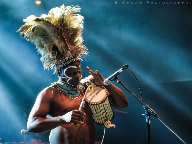 Langa-based international star, traditional African music performer and ethnomusicologist Dizu Plaatjies in action in full regalia.