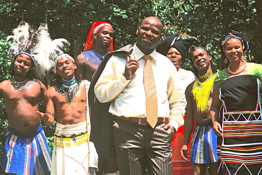 True African music practitioners . . . a suited Dizu Plaatjies with members of his band.  Photo: P. Lee-Thorp