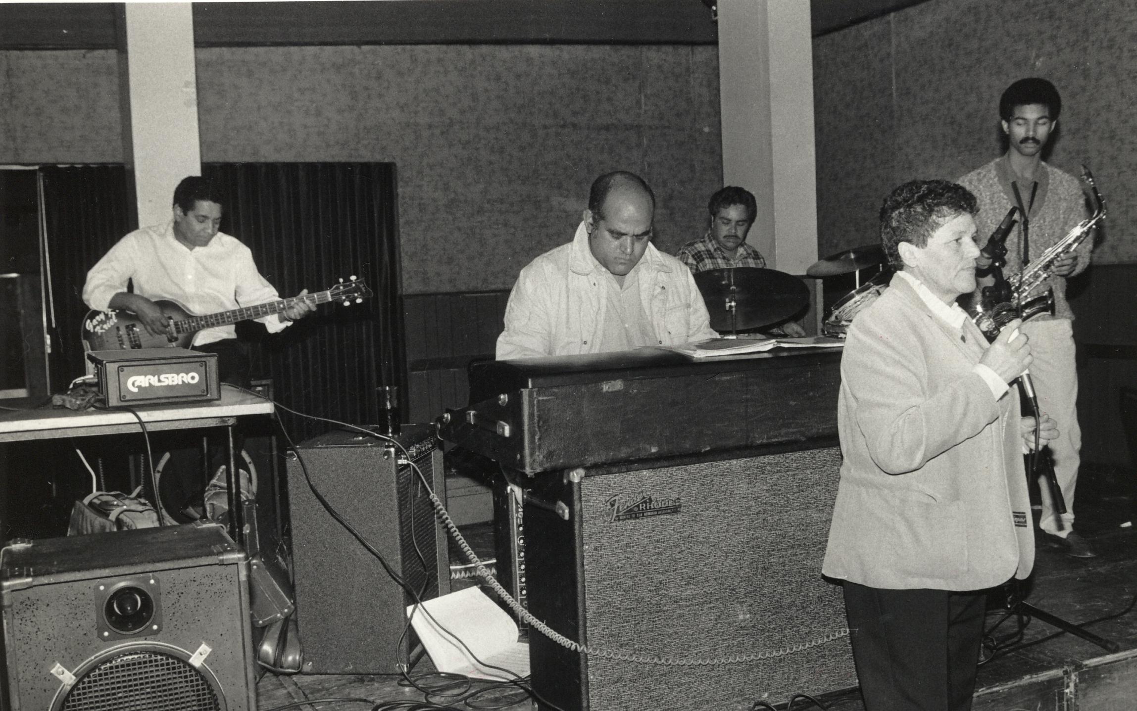 A blast from the past . . . Jimmy Adams (front left), playing with his granddaughter, Bonita, with Basil Moses, Gary Hendrickse and Willie van Bloemestion adding some grunt to the combo.