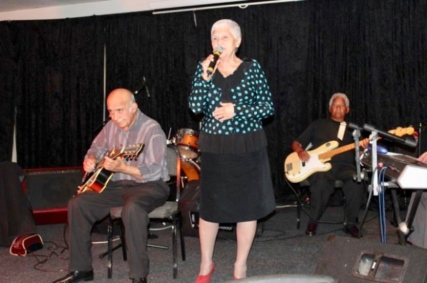 The octogenarian entertainers . . . Harry Peacock on guitar, singer Zelda Benjamin and plucking the bass at the back, birthday boy Gary Kriel.