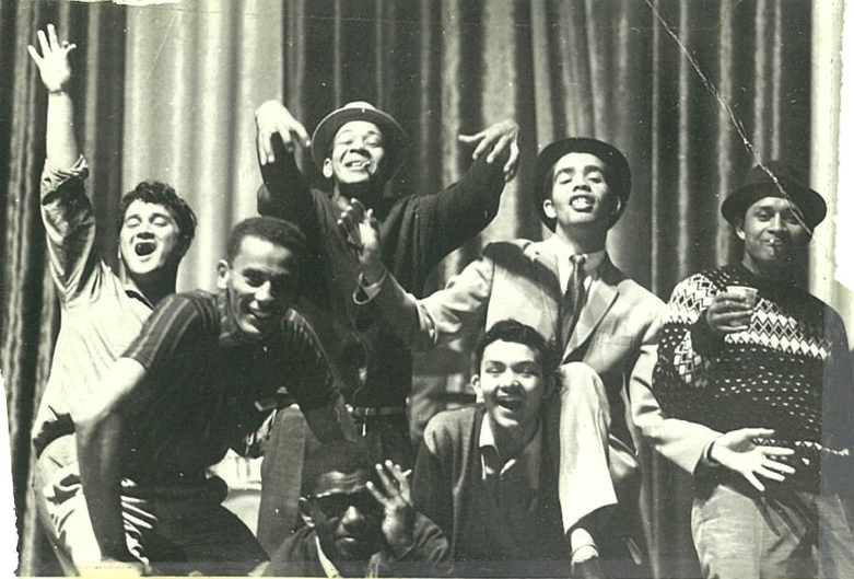 Gobi Martin living it up with his fellow entertainers on the night he won the Mr Entertainment title in the Luxurama in 1965. From left are Ebrahim Parker, Freddy Isaacs, Gobi Martin and Al Hendricks. In from is Neville Hearn, a Post Newspaper man enjoying the fun of the night.