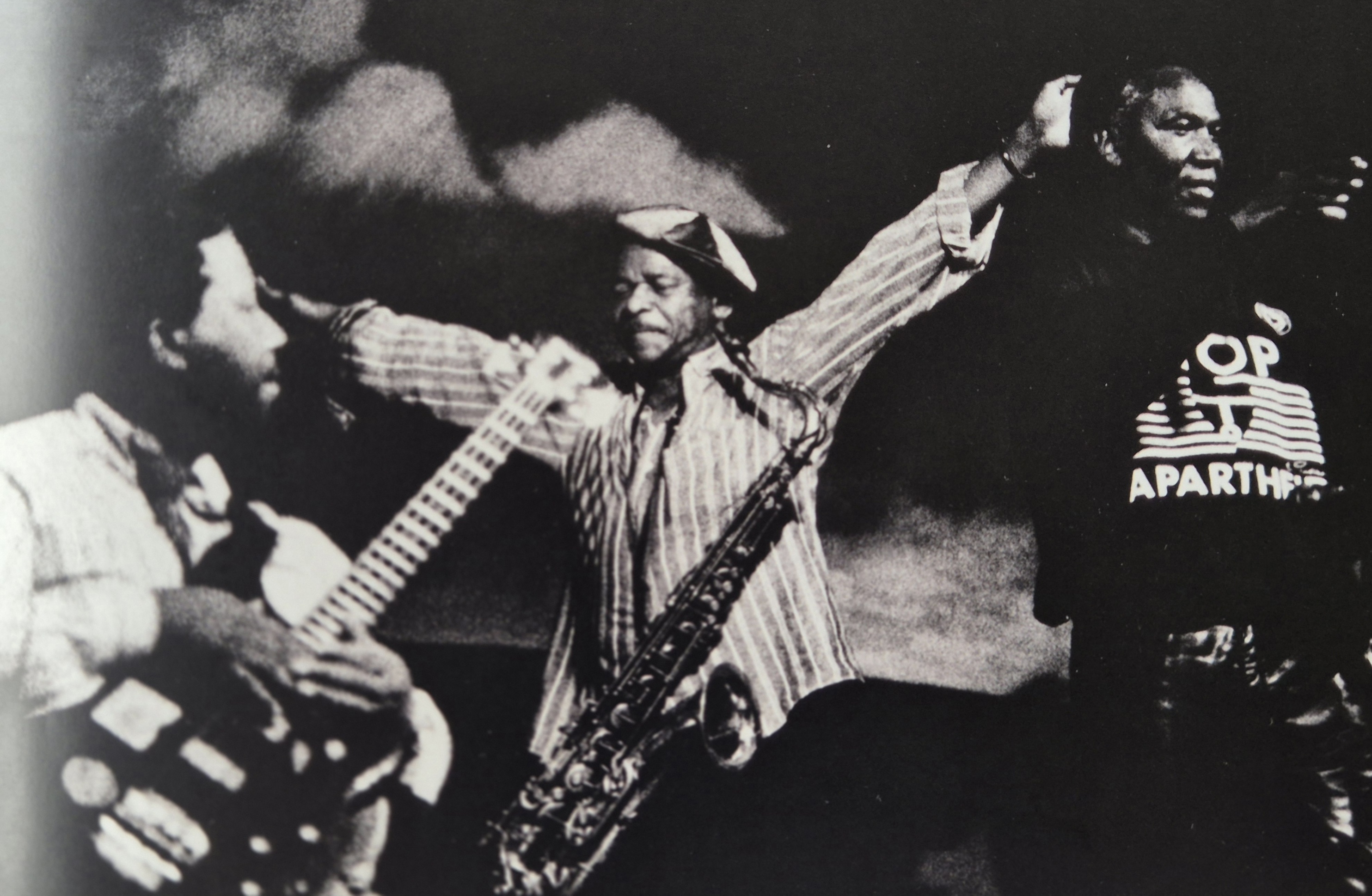 Cape Town-born jazz giant Winston Mankunku Ngozi acknowledging the adulation of his legion of fans at a Struggle gig back in the day. [Photo reproduced from photo-journalist Rashid Lombard’s book, Jazz Rocks.]