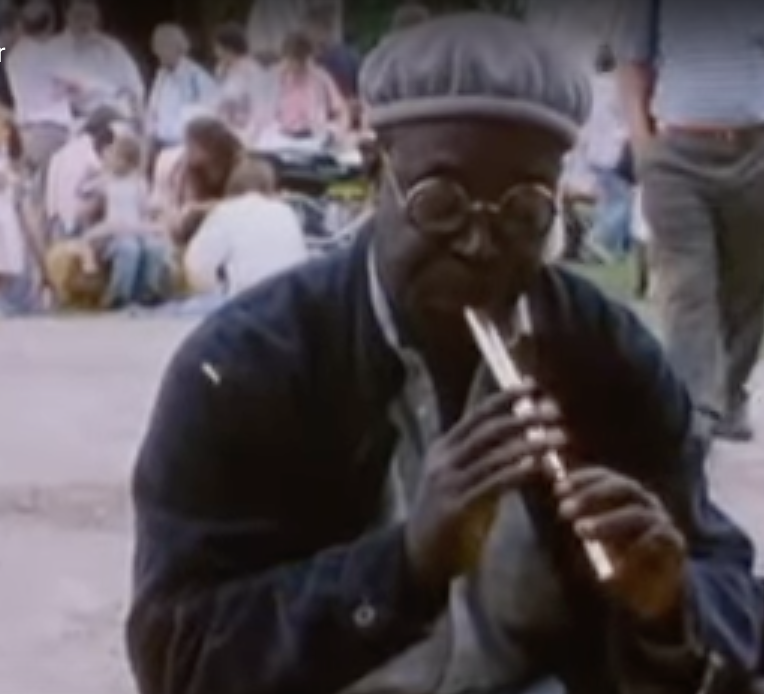 Robert Sithole showing off his prowess on the pennywhistle at a celebration of the instrument in London in 1992.