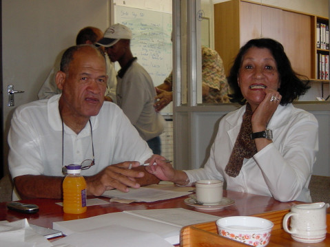 Ronnie Green chewing the fat with another Cape Town jazz legend, the late Sathima (Bea) Benjamin, wife of Abdullah Ibrahim. Pic courtesy Bush Radio