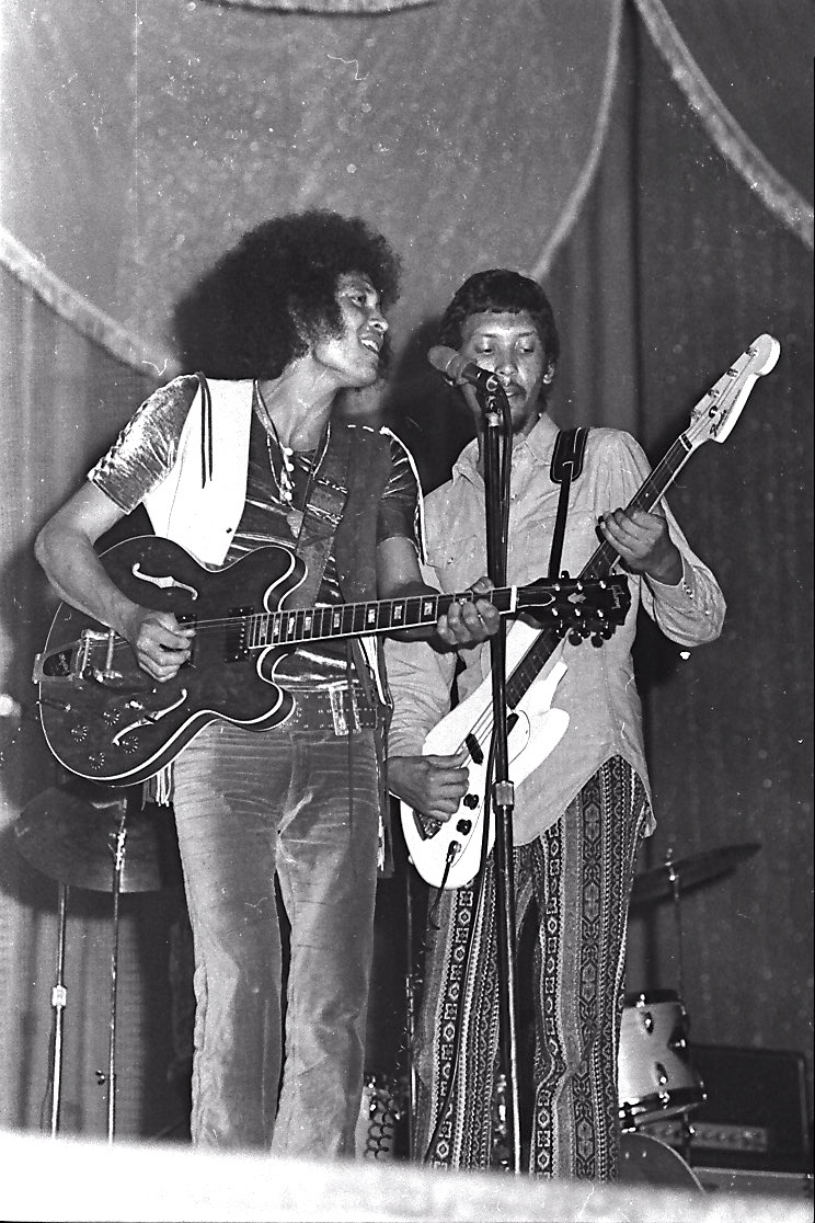 Steve Fataar, left, on stage with his sibling, Brother Fataar at their farewell concert at the Luxurama in the late Sixties.